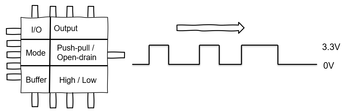 Output Buffer를 0으로 설정하게 되면 스위치가 On이 되며 Output 핀이 내부 그라운드와 연결되고 0V로 당겨지게 됩니다.
