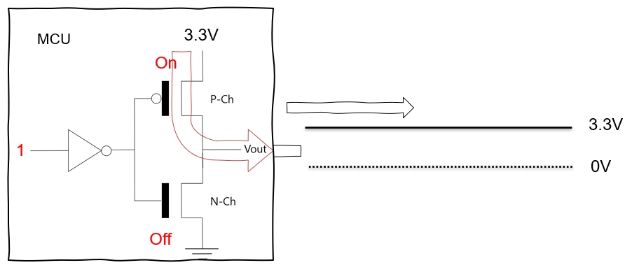 이때 P-Ch은 On이 되고 N-Ch은 Off가 됩니다. 내부의 3.3V가 Output Pin에 걸리게 되어 3.3V가 출력 되게 됩니다.