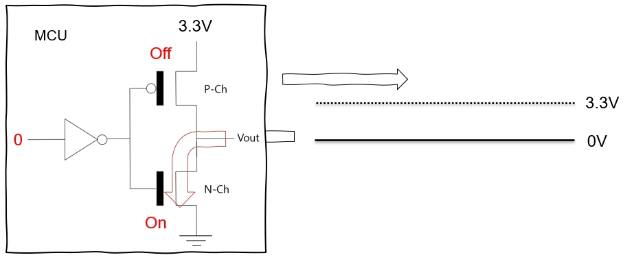 P-Ch의 스위치는 Off가 되고 N-Ch 스위치는 On이 되어 외부의 전류가 내부 그라운드로 흘러들어와 전압이 0V가 됩니다.