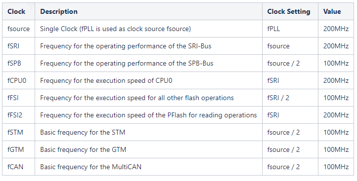 TC275 Lite Kit 레퍼런스 매뉴얼 Table 1에서 보면 CPU Core Aurix의 Max Frequency가 200 MHz인 것을 또 하나 얻었습니다. CPU가 최대로 만들수 있는 클럭의 주파수가 200MHz라는 뜻입니다.