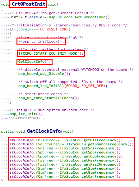 기존의 프로젝트에서 Crt0PostInit > bsp_uc_InitClock() 에서 Clock을 설정해 주고 있었기 때문에 주석 처리하고 iLLD에서 IFXCPU_CSTART_CCU_INIT_HOOK()을 호출하였고 그다음 GetClockInfo()를 호출하여 현재 상태의 클럭을 확인해 보았습니다.