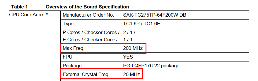 TC275 Lite Kit 레퍼런스 매뉴얼 Table 1에서 보면 CPU Core Aurix의 Max Frequency가 200 MHz인 것을 또 하나 얻었습니다. CPU가 최대로 만들수 있는 클럭의 주파수가 200MHz라는 뜻입니다.