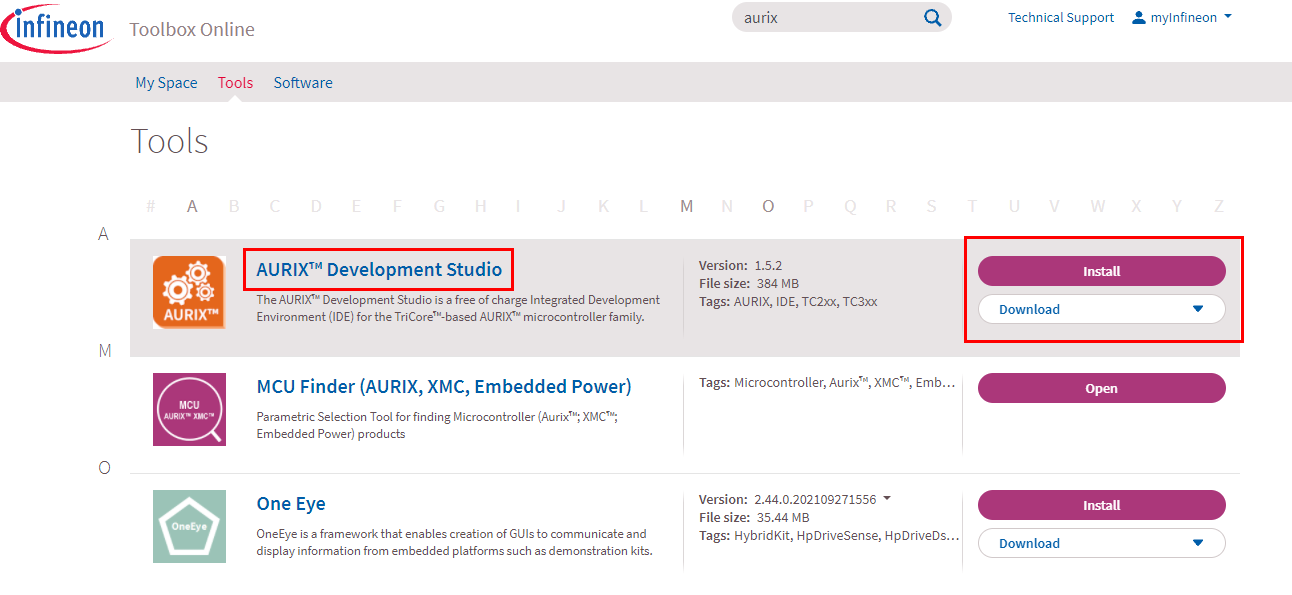 인피니언 홈페이지에 Aurix Development Tool을 설치할수 있는 링크가 아래에 있습니다.