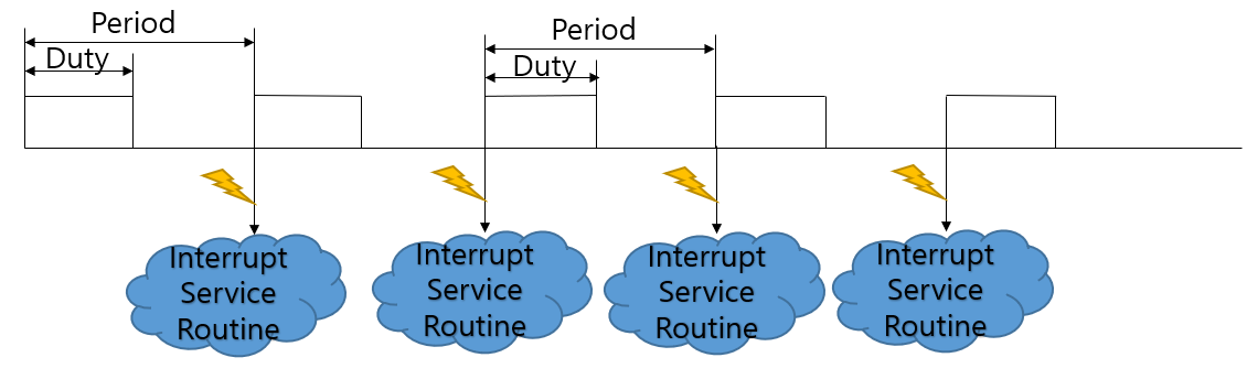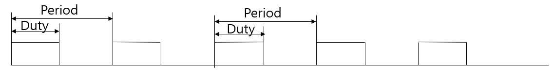 그래서 우리는 이 PWM을 Period와 Duty라는 2가지 인자를 가지고 3가지 방식으로 모양을 만들어 낼 수 있습니다. Period를 고정시킨 상태에서 Duty만을 가변하여 사용하는 방법, Duty를 고정시킨 상태에서 Period를 가변하는 방법, Duty와 Period를 둘다 가변하는 방법입니다.