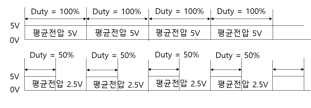 PWM의 Duty를 100%로 출력하게 되면 평균 전압으로 치면 5V가 되게 됩니다.
