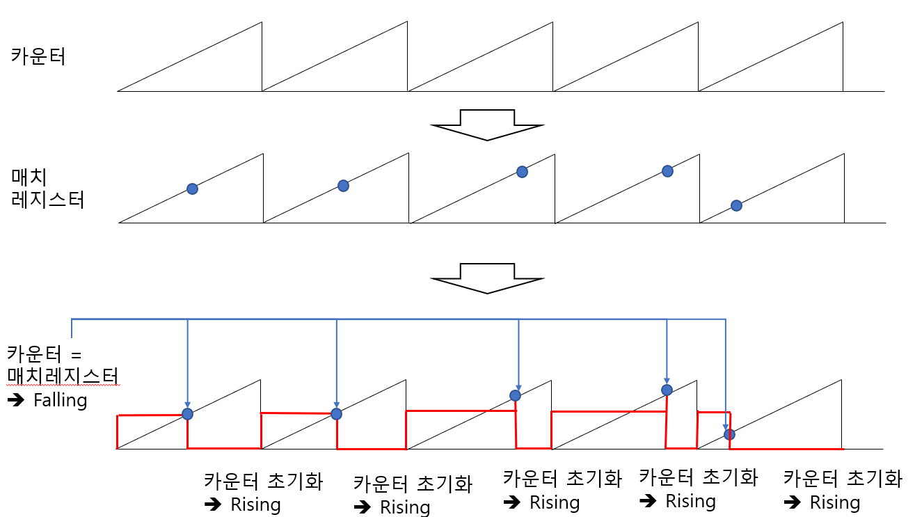 이때 동작을 Falling으로 동작 시키고 카운터가 Max가 되어 초기화가 되면 Rising으로 동작시키게 되면 아래와 같이 PWM이 만들어지게 됩니다.