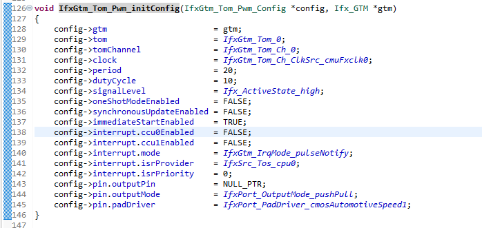 IfxGtm_Tom_Pwm_initConfig(&g_tomConfig, &MODULE_GTM);