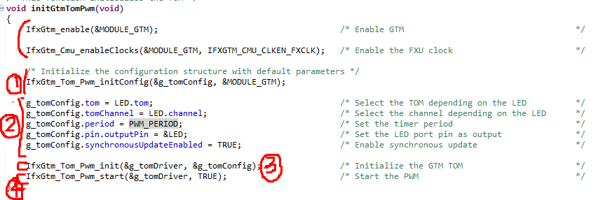 그리고 3번에서는 설정된 g_tomConfig 구조체의 주소값을 넘겨주면서 iLLD에서 GTM_TOM모듈의 레지스터를 세팅해주고 있습니다. 그리고 4번에서는 GTM_TOM 모듈을 동작하라는 명령을 주고 있습니다.