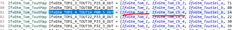 TOM0 모듈에서 TOM_CH0 을 선택하겠다는 의미입니다. TOM_CH0은 TOM_CH0_OUT 쪽으로 TOM모듈 밖으로 PWM을 출력하게 됩니다.
