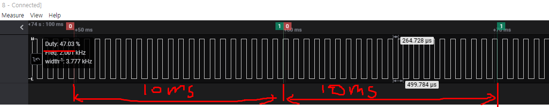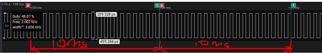 실제로 10ms 마다 1%씩 듀티의 변화가 있는 것을 확인할 수 있습니다.