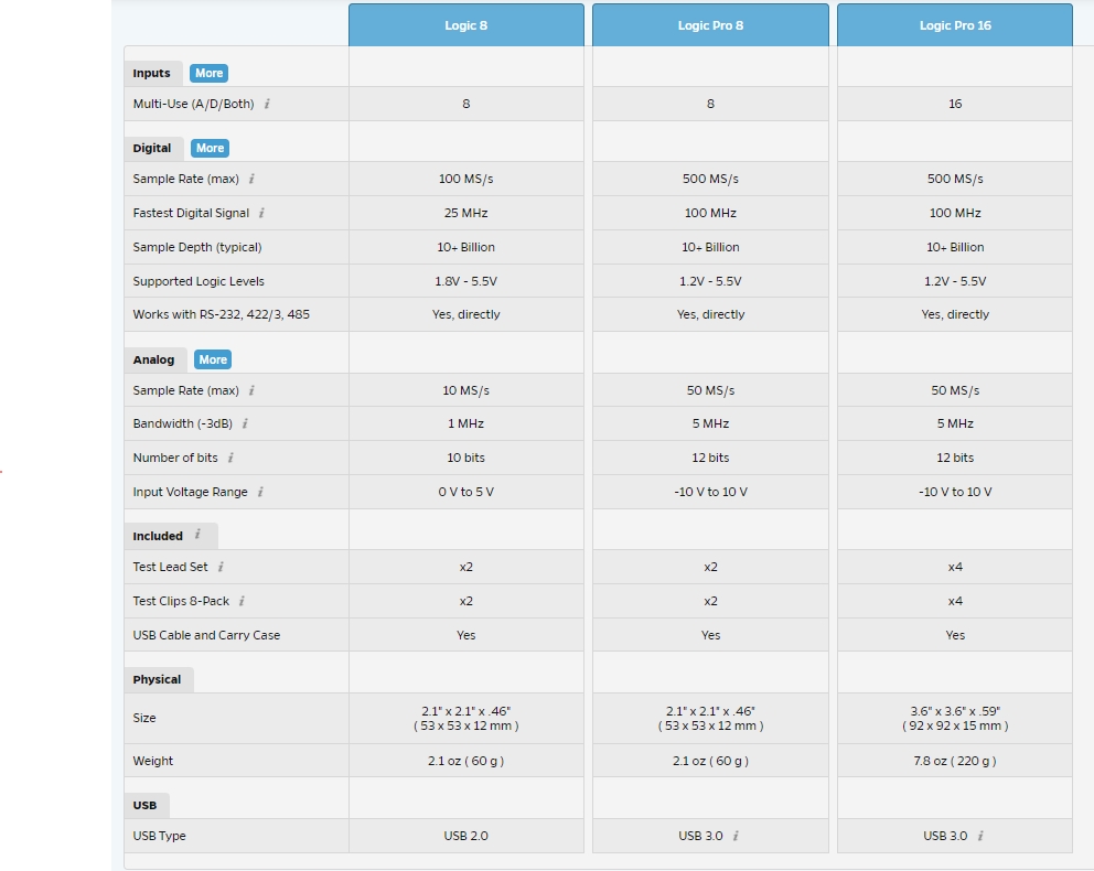 Digital과 Analog 시그널 모두 측정이 가능하며 채널 개수와 측정 범위나 Sampling 개수가 차이가 나서 타입이 나뉘고 있는 것을 확인할 수 있습니다.