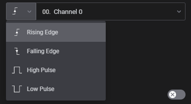 | Trigger | 1. 오실로스코프에 Trigger 기능과 똑같은 기능이라고 보면 됨. 2. Trigger 조건으로는 Rising Edge, Falling Edge, High Pulse 구간, Low Pulse 구간을 이용하게 됨. ![]() |
