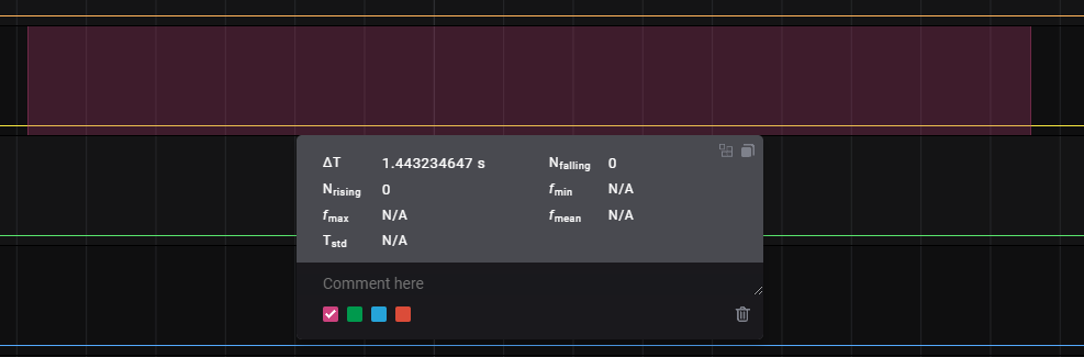 Measurements는 내가 측정하고자 채널의 특정 구간을 드래그하여 그 구간에서의 rising 또는 falling의 개수를 알 수 있으며, 주파수의 최솟값과 최댓값과 평균값을 알 수 있는 기능입니다.