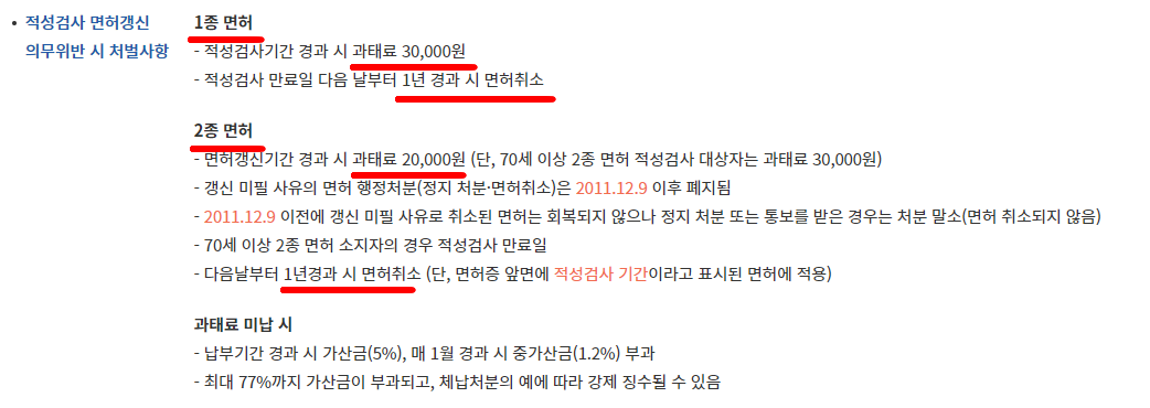 1종은 3만 원 2종은 2만 원 과태료가 있으니 꼭 기간 내에 면허 갱신하시기 바랍니다.