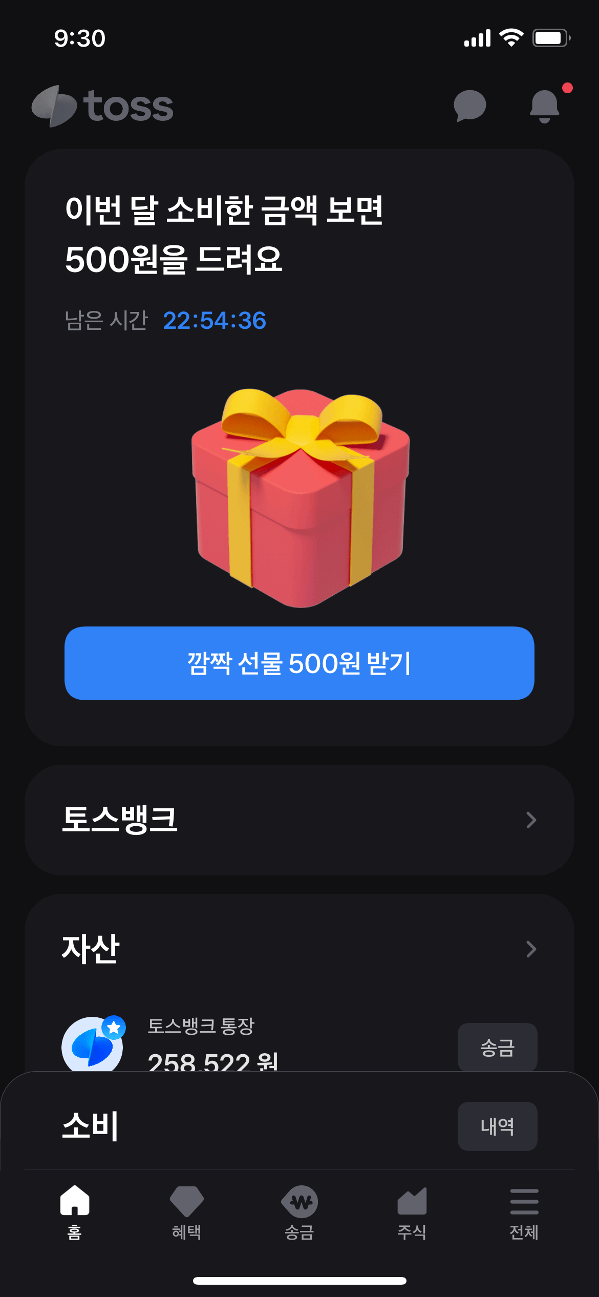 안드로이드 폰이든 아이폰이든 토스 어플을 설치하고 어플을 실행시키면 아래와 같은 화면을 만나시게 됩니다.