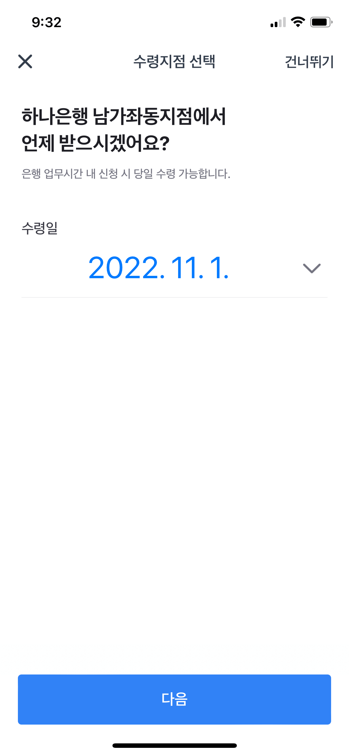 수령하고 싶은 가까운 동네를 입력하면 가까운 하나은행 지점을 선택할 수 있게 됩니다.